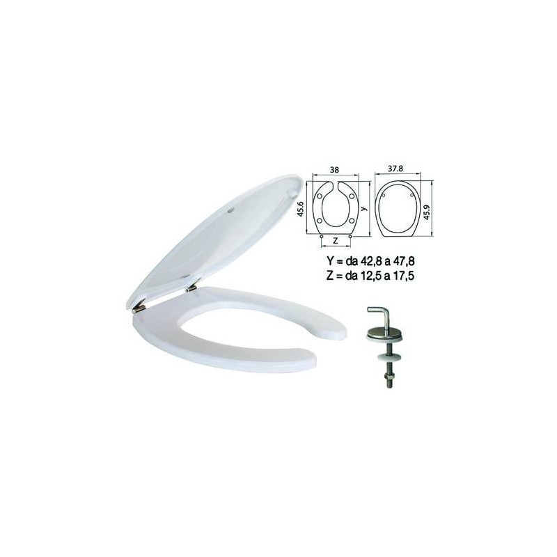 sedile wc in termoindurente con forma universale adatta per ceramiche a forma ovale - l’anello con apertura frontale è studiato per persone con difficoltà motorie - la seduta è ergonomica e rialzata per offrire il massimo comfort - 4 paracolpi grandi ed antiscivolo che garantiscono stabilità e tenuta - cerniere in acciaio inox - facile da installare, con la chiavetta in dotazione per la cerniera - colore bianco, brillante e inalterato nel tempo - resistente ai graffi e alla polvere - adattabilità: universale - peso kg.2,7
