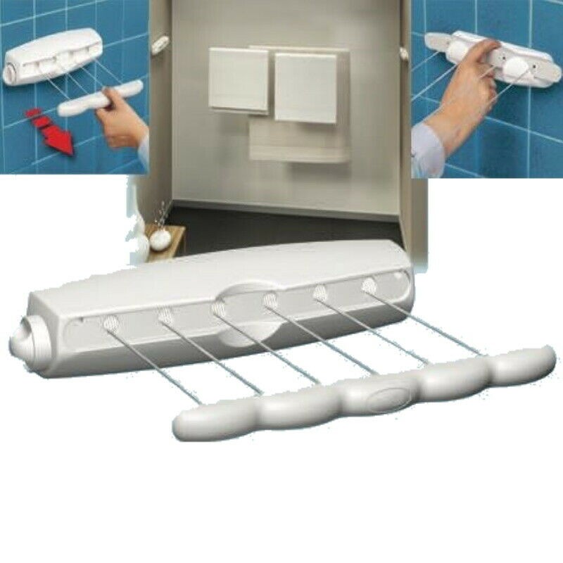 In resina 100% filo Mt. 14. Sistema di bloccaggio sicuro antistrotolamento accidentale, estensione massima Mt. 3,6. Larghezza Cm. 30. Viti e tasselli inclusi.