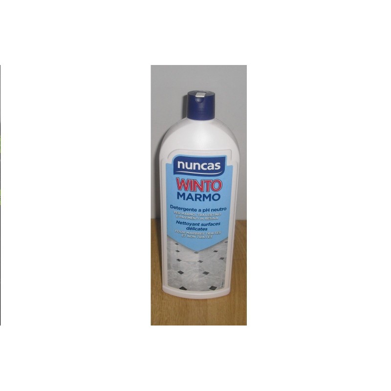 detergente WINTO MARMO marmo,travertino,pavimenti in resina NUNCAS 1LT. 4000525Winto MarmoDetergente neutro specifico per marmo, pavimenti in resina e granigliati Il marmo è un materiale di grande bellezza e se ben mantenuto dona agli ambienti della casa una luminosità ed una eleganza senza eguali. Ma si tratta di una roccia cristallina, sensibilissima alle sostanze acide, che possono addirittura corroderla, e insieme alla sua porosità, che pochi conoscono, ne fanno un materiale di cui avere cura con prodotti specifici, che non ne alterino il colore e le sue naturali venature. Winto Marmo è un detergente specifico per il marmo che garantisce due azioni fondamentali durante il normale lavaggio della superficie: stacca lo sporco in profondità, senza aggredire la superficie naturalmente porosa del marmo e senza rimuovere cere e trattamenti di protezione. La sua formulazione a pH neutro, pulisce efficacemente senza lasciare aloni e rispetta il colore, la brillantezza e la fragilità di questa superficie naturale. Colorato con un colorante alimentare totalmente solubile, garantisce di non alterare il colore o la finitura a specchio dei tuoi marmi preziosi. (le dosi sono riportate in etichetta)Winto Marmo si usa diluito in acqua secondo le proporzioni indicate. Si passa una sola volta, usando uno straccio morbido che non lascia pilucchi.