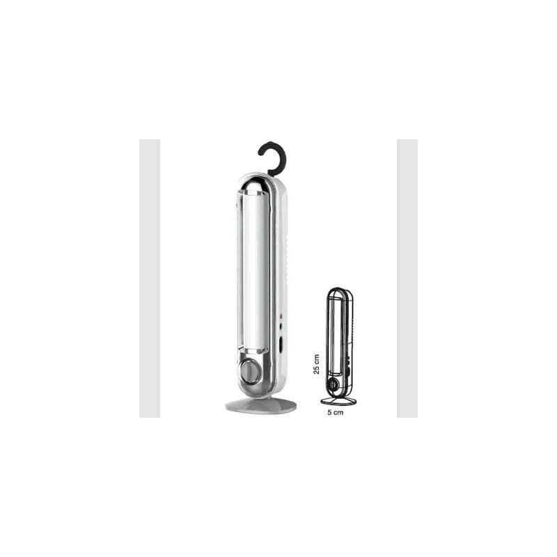 18 led - alta intensità: 250 lumen, autonomia 3h- bassa intensità 20 lumen, autonomia 20h - intensità luminosa regolabile - funzione di emergenza in caso di black out - caricabatterie incluso - gancio a scomparsa per trasportare o appendere la lampada - spia led indicatore di ricarica
