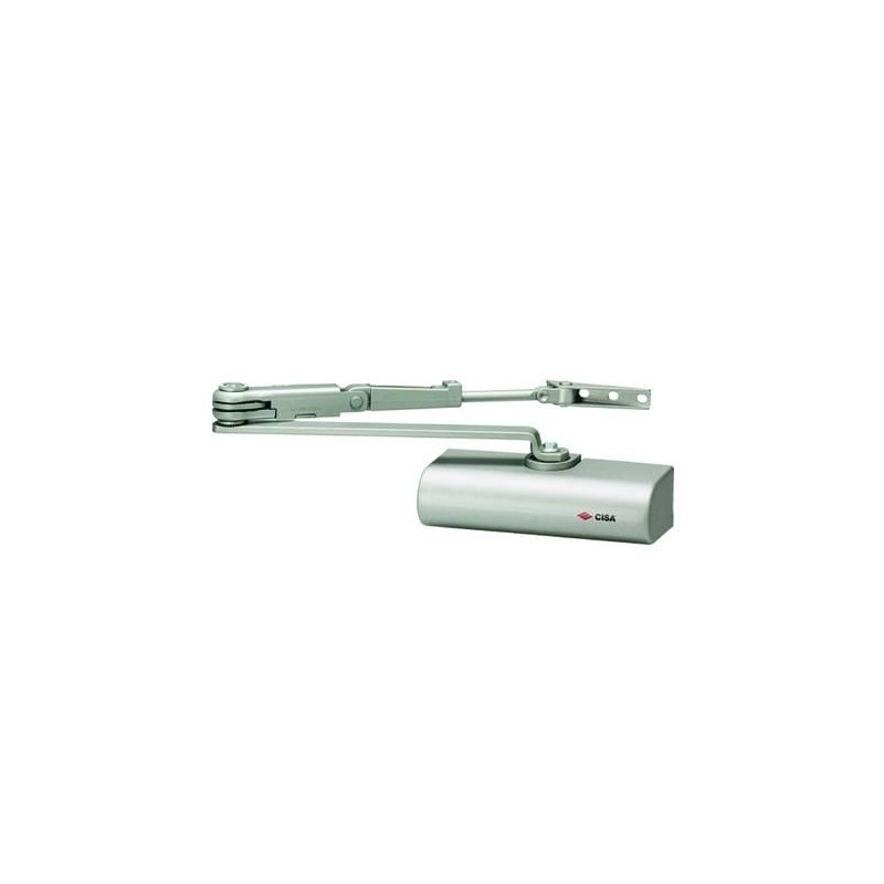 corpo monoblocco in lega d’alluminio, braccio in acciaio con arresto, carter in nylon, valvola di regolazione della velocità di chiusura, forza di chiusura regolabile n° 2-3-4, per porte da cm.85÷110 max con peso da Kg.45÷80 max