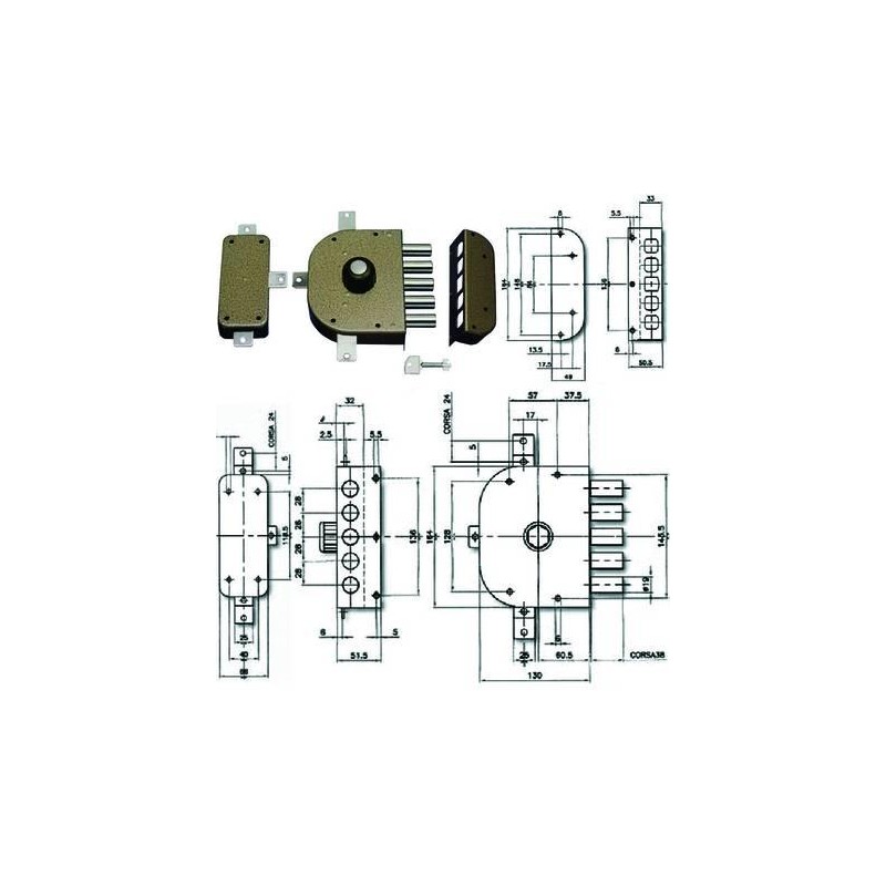 - 2 mandate, scatola in acciaio verniciato, catenacci a pistoni con interasse mm.28 in acciaio cromato, cilindro a pompa lato esterno, pomolo lato interno, dotazione: 1 mostrina cromata, 1 ferrogliera, 1 deviatore, viti e minuteria, 3 chiavi a pompa, aste non comprese