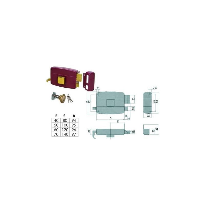 scatola e bocchetta in acciaio verniciato, catenaccio 2 mandate con scrocco separato, tirante e pomolo interno in ottone, cilindro staccato, dotazione: 3 chiavi