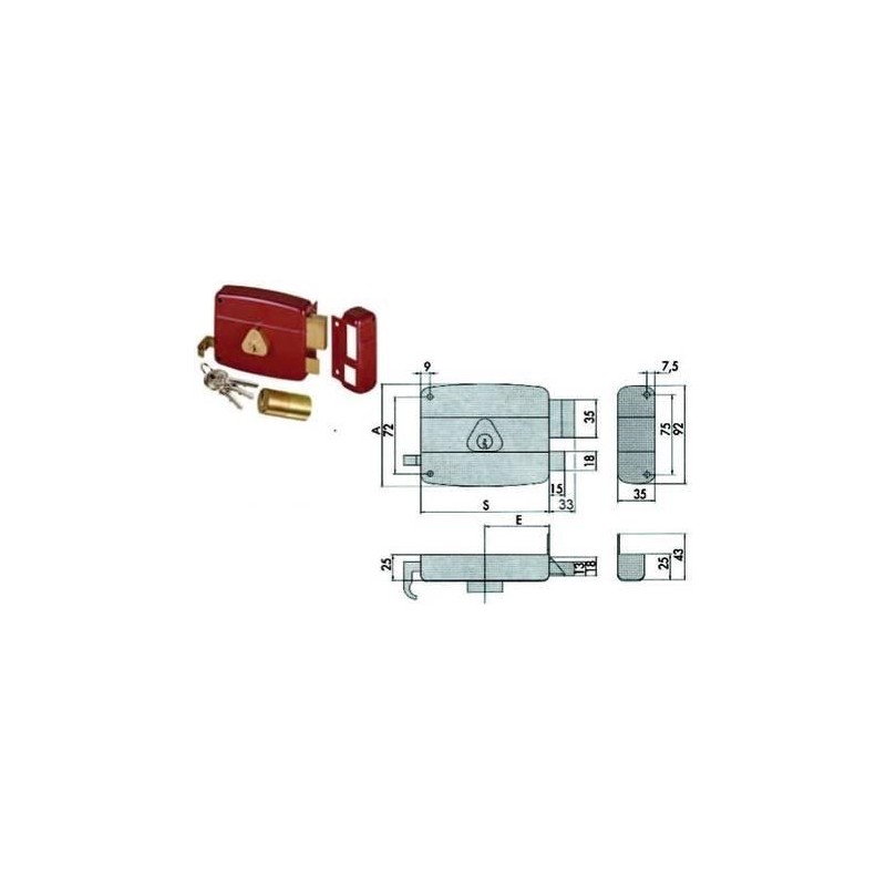 scatola e bocchetta in acciaio verniciato, catenaccio 2 mandate con cilindro interno e scrocco separato, tirante interno in ottone, cilindro fisso, dotazione: 3 chiavi
