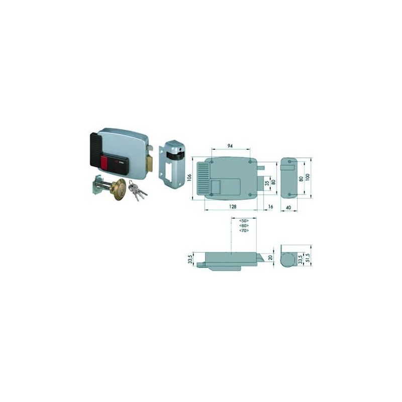 scatola e bocchetta in acciaio verniciato grigio alluminio, tensione 12v AC, scrocco autobloccante, apertura dall’interno con pulsante, cilindro staccato, dotazione: 3 chiavi