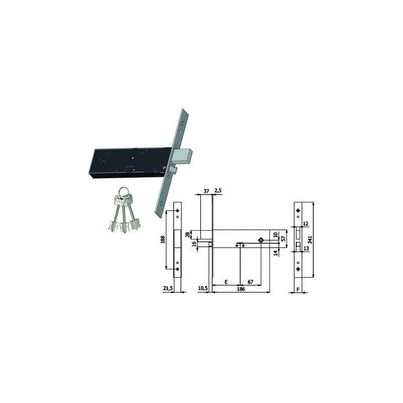 scatola e coperchio in acciaio zincato e plastificato - frontale in acciaio inox mm.25 - catenaccio in acciaio nichelato - scrocco regolabile in lega speciale nichelata - catenaccio comandato dalla chiave - scrocco comandato dalla chiave o dalla maniglia - reversibile - 4 mandate - in dotazione: 3 chiavi, 2 sottofrontali, coppia borchie, viti di fissaggio in acciaio inox, istruzioni di montaggio