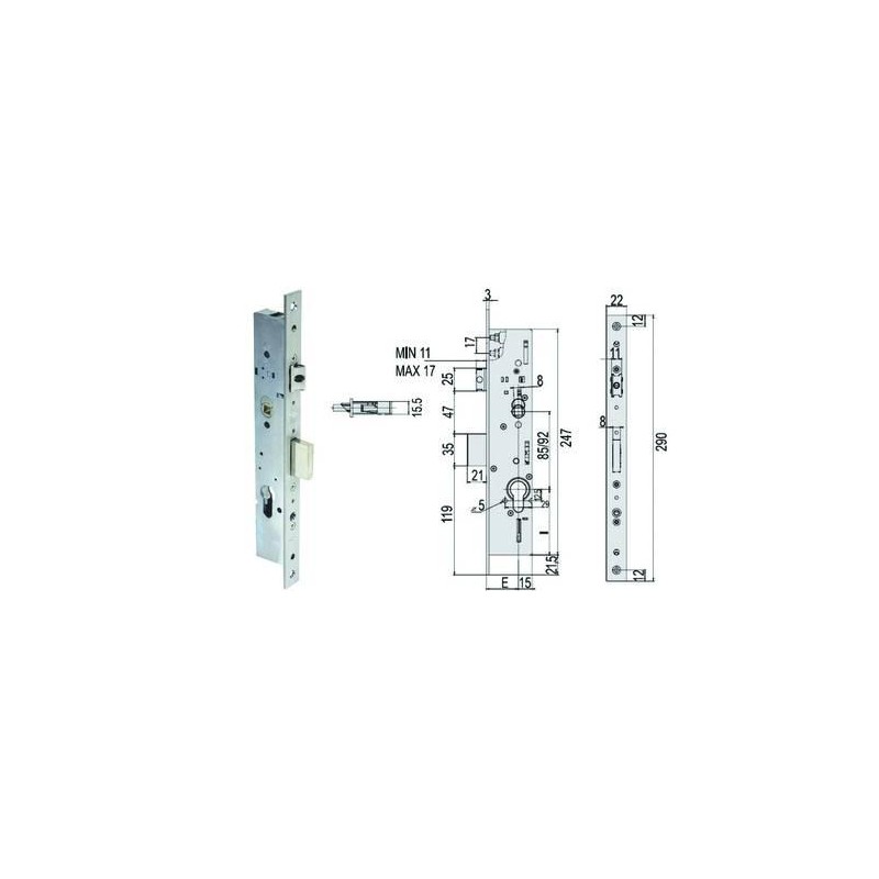 serie MULTITOP con dispositivo di azionamento tramite sistema a ingranaggi che riduce lo sforzo sulla chiave, scatola in acciaio con rivestimento in zinco, frontale in acciaio inox, scrocco e catenaccio a scorrimento orizzontale, scrocco regolabile, con quadro maniglia da mm.8 passante, predisposizione per chiusura supplementare, coppia borchie in nylon, perni filettati delle prolunghe, funzionante con cilindro sagomato non compreso
