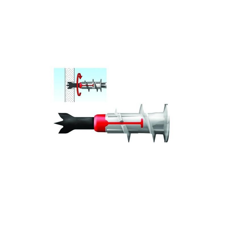 pronto all’uso: la punta metallica è preinstallata e può essere applicato direttamente - punta autoforante e centrante consente di forare anche materiali rigidi - elica rinforzata assicura una profonda perforazione delle lastre - lamelle anti-rotazione garantiscono il bloccaggio del tassello in fase di installazione della vite- impronta PZ2 sul tassello e sulla vite per un minor tempo di applicazione - combinazione bi-materiale (nylon-fibra) - può essere abbinato a viti legno, autofilettanti o truciolari da mm.4 a mm.5 - profondità minima del foro mm.50 - profondità minima di inserimento 28 - lunghezza ancorante mm.44