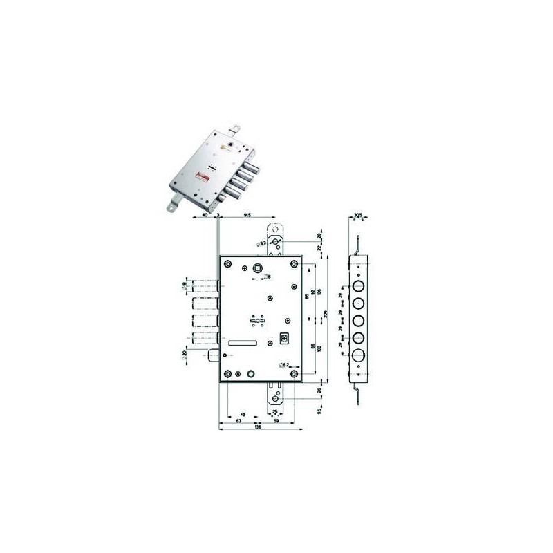 scatola in acciaio zincato, catenacci e scrocco a pistoni con interasse mm.37 in acciaio cromato, 4 mandate, scrocco azionato da chiave o quadro maniglia, dotazione: 1 mostrina interna, 1 mostrina esterna, 3 chiavi con gambo mm.40, aste non comprese