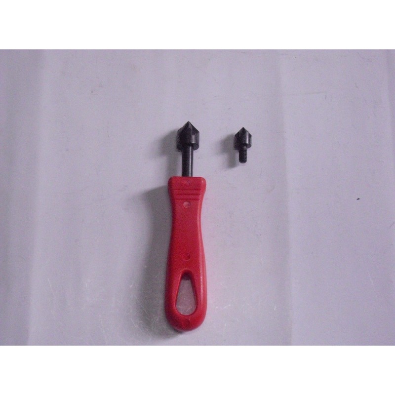 In acciaio legato temprato.Esecuzione brunita. Impugnatura in plastica. Con due teste frese coniche intercambiabili da diametro mm 12 e 16.