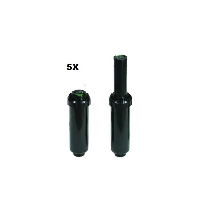 sollevamento cm.10 - attacco con filetto F 1/2" - arco regolabile da 40° a 360° - pressione di esercizio da 2,1 a 3,4 bar - portata da 0,10 a 0,77mc/h. - portata da 1,6 a 12,9 lt/min. - 6 ugelli semplici, utilizzabili con il nuovo dispositivo integrato di regolazione della gittata (vite rompigetto) permette un'irrigazione presisa senza traboccamenti, un solo giro di vite e sarete in grado di irrigare dove desiterate - gittata da mt.4,3 a mt.9,1- diametro di copertura da mt.7,6 a mt.13,7 - misure ø mm.55x170h. - turbina lubrificata ad acqua che assicura una lunga durata - filtro di grandi dimensioni che mette fine all'ostruzione degli ugelli - statore variabile che mantiene la velocità di rotazione costante a prescindere dalle dimensioni dell'ugello e dalla pressione d'esercizio