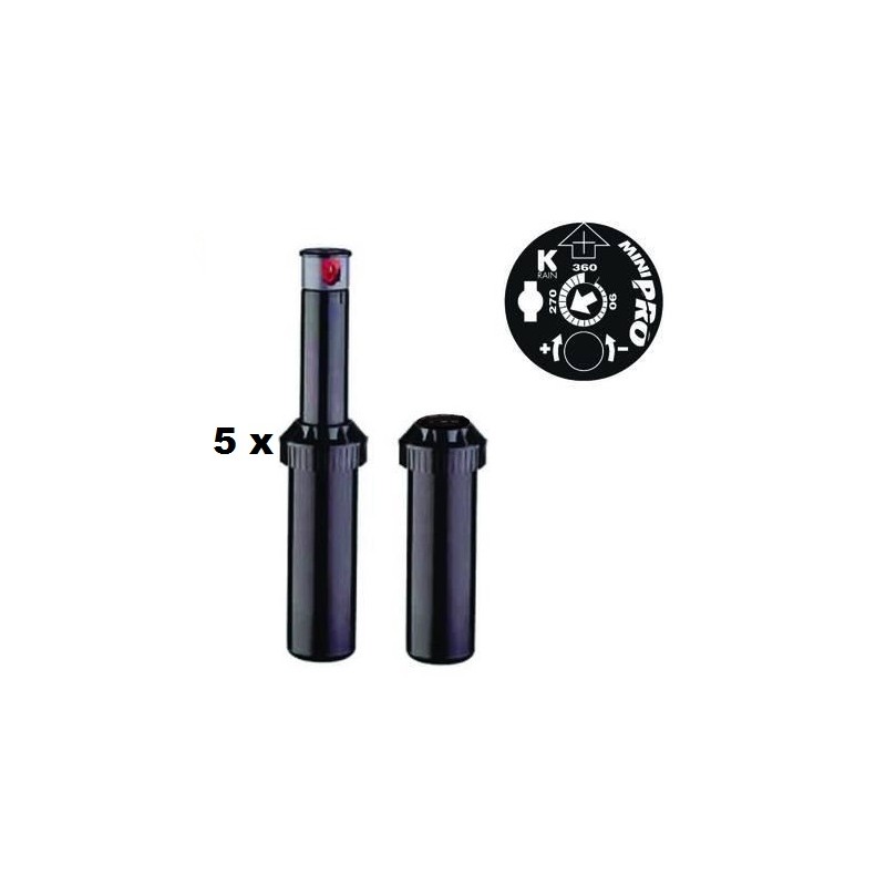 pressione di esercizio min 2,1 bar max 3,4 bar - portate testine da 2,8 l/min a 12,5 l/min - settori regolabili da 40° a 360° - 5 ugelli intercambiabili - angolo di traiettoria 26° - ugello 1,5 premontato - raggi da 5,1m a 9,0m - coperchio con indicatore di angolo - altezza corpo cm.15