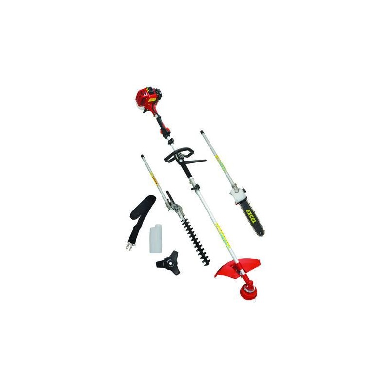 - cc.33 - kW 1,05 di potenza - motore 2 tempi a miscela (benzina+olio) - PRIMER per un facile avviamento - accensione elettronica - avviamento a strappo - capacità serbatoio di lt.065 - trasmissione rigida con sistema antivibrante - tubo ø mm.26 - impugnatura anteriore regolabile a delta - asta sganciabile al centro con sgancio rapido dell'accessorio; riduce l'ingombro dell'utensile consentendone un più facile trasporto - corredato con: accessorio decespugliatore, accessorio troncarami-potatore con barra cm.30 e catena maglie n°44 passo MINI 3/8" spessore 050" (1,3mm.) - accessorio tagliasiepi orientabile con doppia lama mm.410 e capacità max di taglio mm.24 - dotazione: testina attacco F 10x1,25 sinistrorso a doppio filo ø mm.2,4 con avanzamento automatico batti e vai + 1disco a 3 denti ø mm.255 + cinghia tracolla - peso corpo macchina senza accessori Kg.4,2