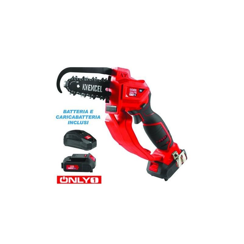 alimentazione 1 batteria 18v 2.0/4.0 Ah Litio - regolazione rapida tensione catena - barra EXCEL mm.156 - taglio effettivo mm.110 - catena: 1/4" - maglie 32 - spessore mm.1.1 - velocità m/s 4.7 - peso kg.1.5 - 1 batteria 2.0Ah inclusa - caricabatteria incluso