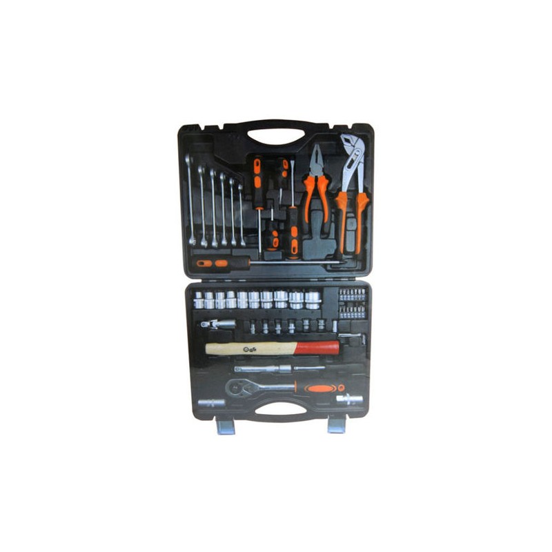 componenti in acciaio chrome-vanadium contenuto: 10 chiavi a bussola esagonali quadro 1/2" misure mm.10-11-12-13-15-17-19-22-24-27 + 6 chiavi a bussola esagonali quadro 1/4" misure mm.8-9-10-11-12-13 + 6 chiavi combinate misure mm.11-12-13-14-15-17 + 1 pinza pappagallo mm.250 + 1 attacco universale da 1/2" + 1 prolunga da 1/2" + 1 pinza universale mm.180 + 2 bussole per candele attacco 1/2" mm.16-21 + 1 martello da meccanico gr.300 + 1 attacco 1/4xmm.65 + 5 cacciavite 8x200, 6x100, 6x40, 6x100(PH2), 6x40(PH2) 1 giunto + 14 inserti da mm.25 assortiti con punta a taglio/torx/esagonale + 4 chiavi esagonali piegate + 1 cricchetto con attacco quadro 1/2" reversibile + 1 cassetta in plastica.