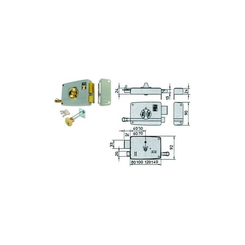 scatola e bocchetta in acciaio verniciato, serratura da applicare per porte in legno, catenaccio 2 mandate con pomolo ergonomico interno e scrocco separato, tirante interno e richiamo con chiave esterno, cilindro staccato 3 chiavi profilo VIRO