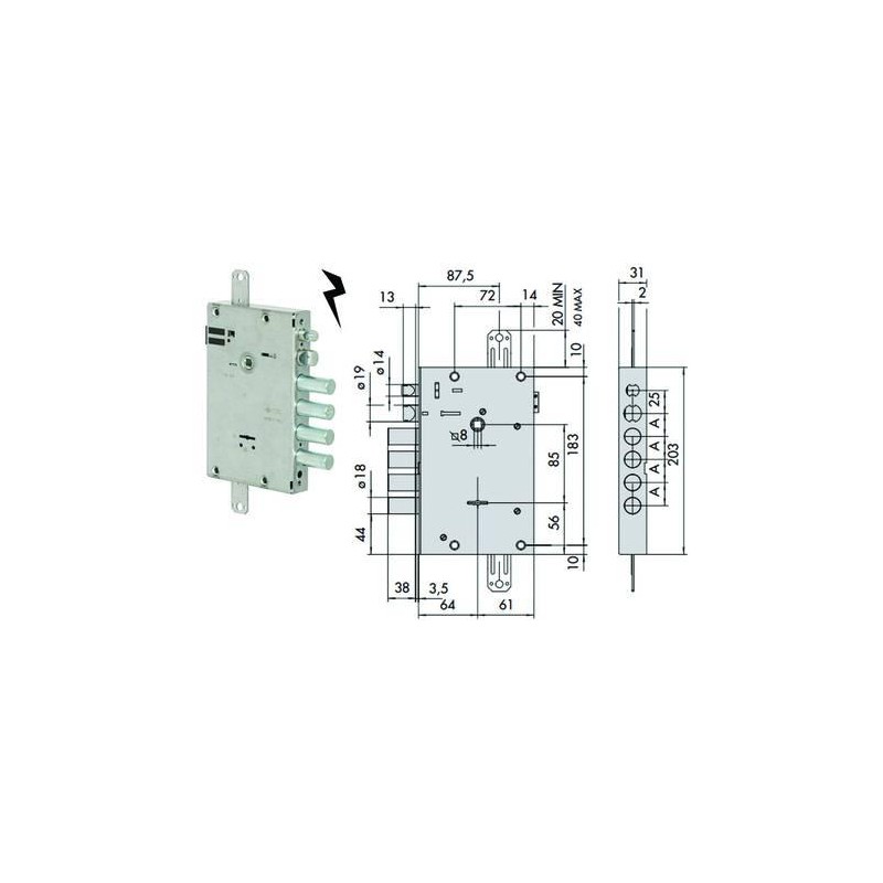 ambidestra - interasse mm.28 - 4 mandate - scatola in acciaio con rivestimento in zinco - catenacci in acciaio zincato alta resistenza - scrocco reversibile zincato alta resistenza - scrocco autobloccante richiamabile elettricamente - predisposizione per chiusure supplementari - tensione 12v ca CE - corrente asorbita 3,1 A - in dotazione: 3 chiavi, cannotto guida chiave, copritoppa interno ed esterno