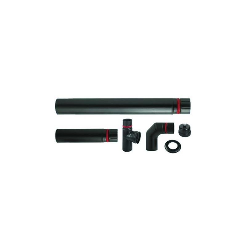 il kit di installazione per stufe a pellet è composto da: pz.1 tubo porcellanato con guarnizione mm.1000h. - pz. 1 tubo porcellanato con guarnizione mm.500h - pz.1 gomito 90° porcellanato con guarnizione 3 settori - pz.1 raccordo a "T" porcellanato con base per scarico condensa, tappo e guarnizione - pz.1 anello di copertura smaltato