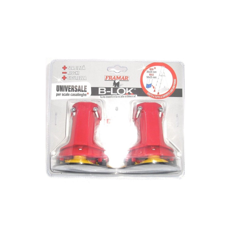 B-LOKTu lo monti e la scala si bloccaPiedino per scale domestiche universale brevettatoDotato di ventose tecniche a presa rapida per fissare la scala su superfici liscie: piastrelle, parquet e marmoNessun graffio sui pavimentiPiù sicurezza grazie alla maggiore superficie d'appoggio della scalaIncluso copriventose protettivoAdatto alla maggior parte delle scale domesticheSi applica ai montanti anteriori, aventi dimensione da min 30x20 mm a max 50x25 mmI piedini originali della scala non vanno rimossiFacile applicazione con viti, incluse