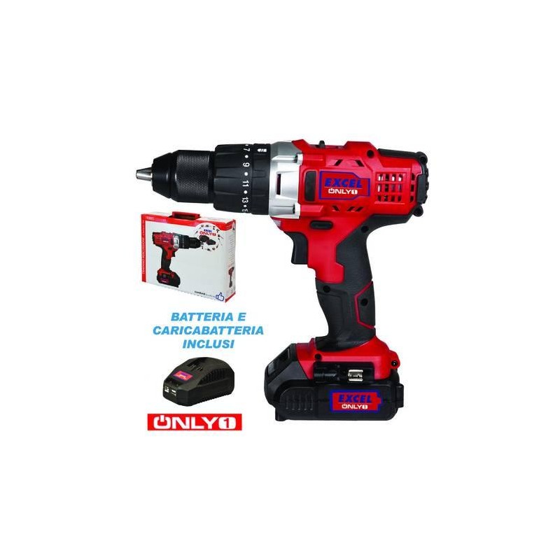 1 caricabatterie 2,4Ah e 1 batteria Litio 18V 2Ah inclusi - 2 velocità regolabili 0-350/0-1200 giri/min. - percussione 0-19200 BPM - mandrino autoserrante 13mm - frizione 19 posIzioni - foratura legno mm.20, metallo mm.10, cemento mm.10 - luce led - gancio cintura - portainserti magnetico - valigetta - peso kg.1,7 - ONLY1 è un sistema che permette con un modello di batteria e un caricabatterie di alimentare indistintamente molte macchine per il fai da te (trapano, smerigliatrice, seghetto, ecc.) e il giardinaggio (tosaerba, decespugliatore, elettrosega, ecc.)