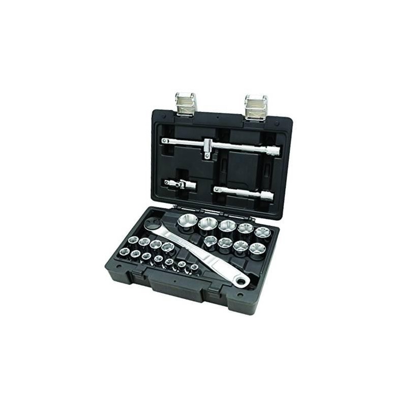- conf.pz.25 composta da: 17 chiavi a bussola da mm.8 a mm.32 (8-9-10-11-12-13-14-15-16-17-18-19-20-21-22-23-24-27-30-32) + 1cricchetto + 2 prolunghe corta e lunga + 1 snodo + 1 quadro c/spina + 1 cassetta
