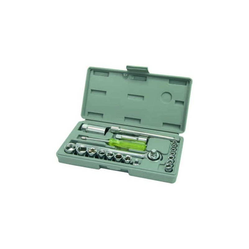 componenti in acciaio cromato, contenuto: 11 chiavi a bussola esagonali quadro 1/4" misure mm.4-4,5-5-5,5-6-7-8-9-10-11-12 + 3 bussole 3/8" misure 13-14-17mm. + 1 cricchetto attacco quadro 3/8" revesribile + 1 riduttore + 1 bussola per candela da mm.21 + 1 giravite con quadro da 1/4" + 2 prolunghe da 3/8" misure da mm.70÷150 + 1 cassetta in plastica misure mm.345x130x40h.
